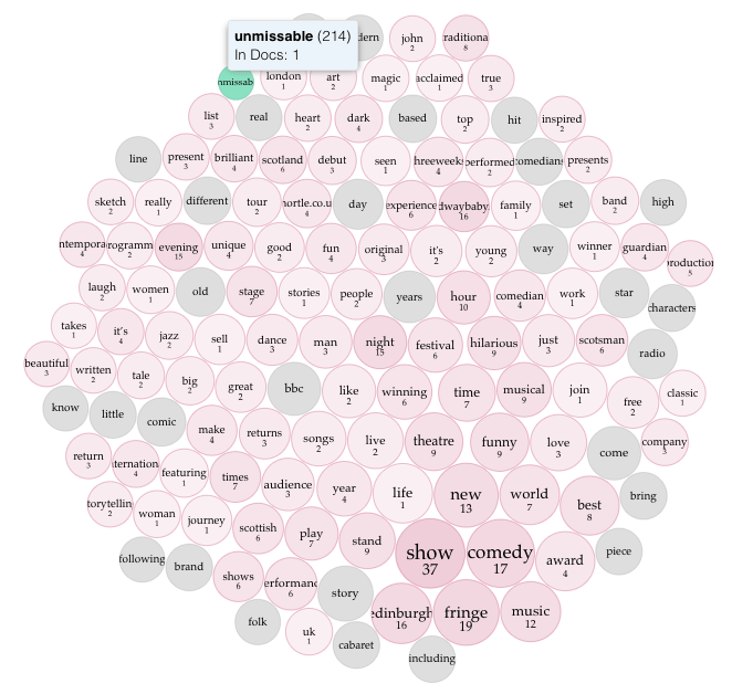 What about the word unmissable? It actually only occurs in 214 show descriptions, with “don’t miss” appearing in 212. One of the interesting things Voyant allows is to see the words that are used around such a word – the collocates – unmissable is most used near show, comedy, Edinburgh, fringe, new and music.